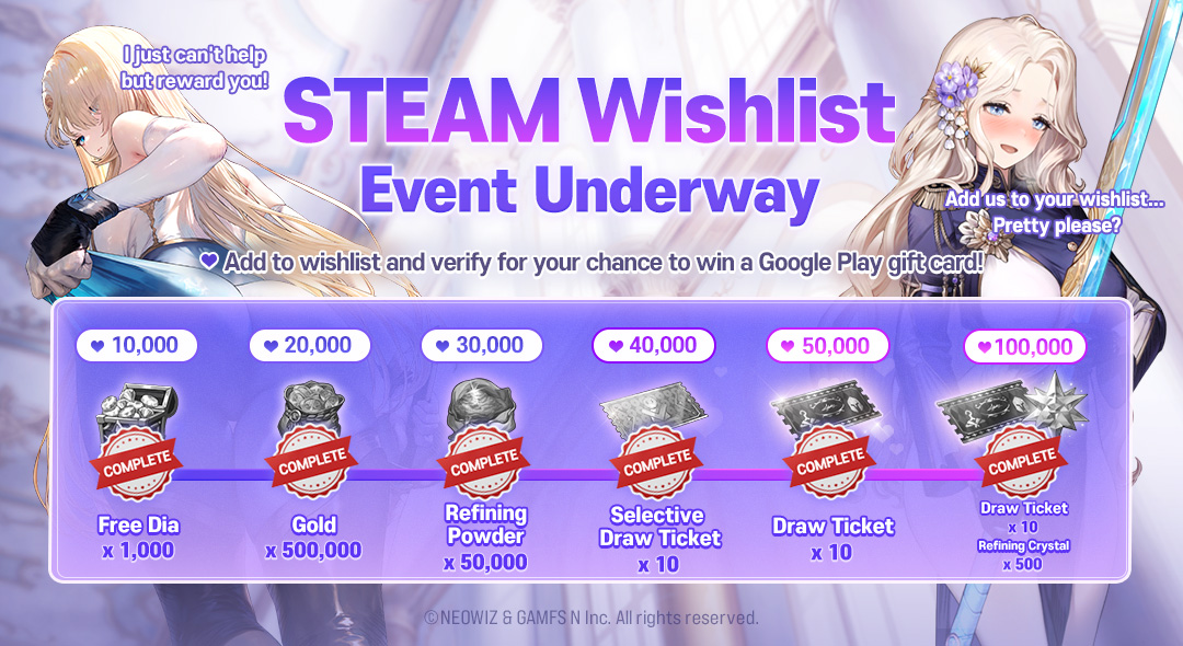 100,000 Wishlists: 10 Draw Tickets + 500 Refining Crystals