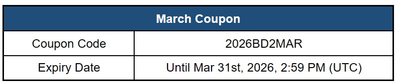 Use coupon code 2026BD2MAR between February 28th, 2026 (3:00 PM UTC) and March 31st, 2026 (2:59 PM UTC) to redeem your offer.