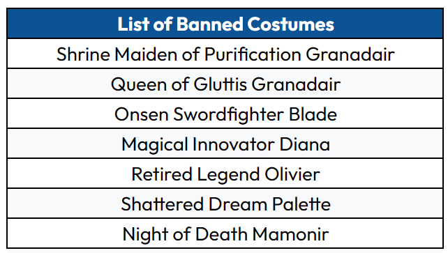 Costumes released after the problematic season but before the event returns won’t be allowed. See the list below for details on which costumes are excluded.