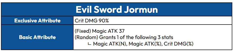 This information applies to the first time you obtain the UR-grade Evil Sword Jormun. For complete details about its stats and abilities, please refer to the Collection section within the game.