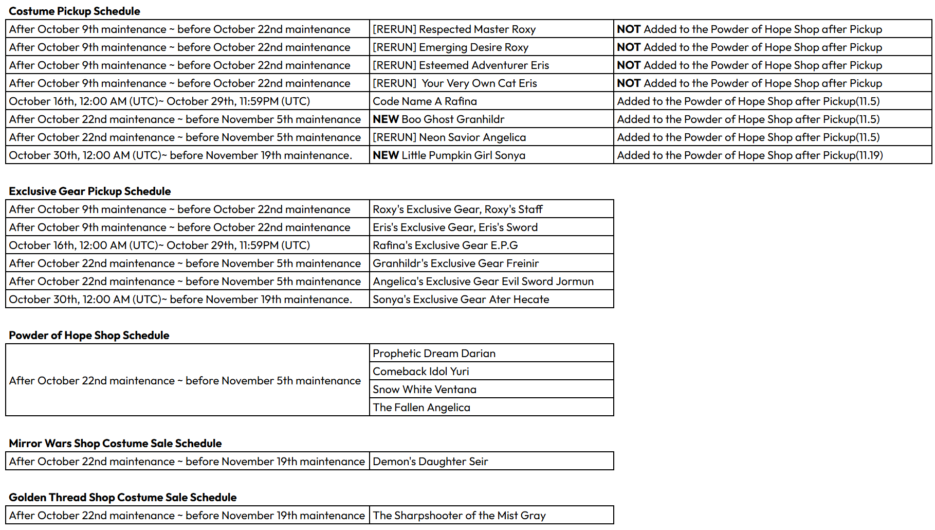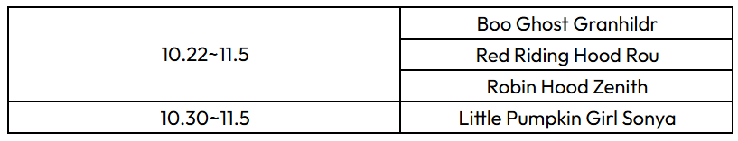 The Little Pumpkin Girl Sonya costume and Ater Hecate gear will be available to collect. You can get the Little Pumpkin Girl Sonya costume anytime between the maintenance on October 29th and the maintenance on November 19th. After November 19th’s maintenance, the costume will be available for purchase with Powder of Hope.