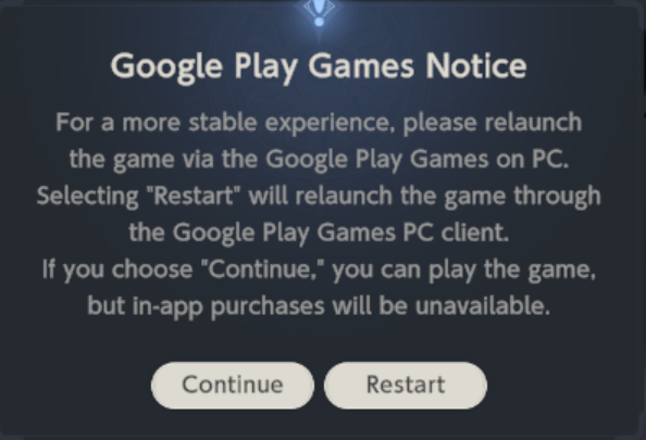 Choose [Restart]. This will close the game and reopen it using Google Play Games on your computer. If you don’t have Google Play Games installed, you’ll keep seeing a message asking you to install it, so please do that first.