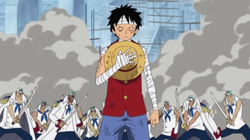 Luffy unexpectedly arrives right in the middle of the battle between the Marines and Whitebeard’s crew. The scene cuts to black, leaving everyone – viewers, admirals, and pirates alike – wondering what he’s planning. It’s immediately clear that Luffy’s only goal is to rescue Ace. The following episode will show Luffy trying to reach the execution platform, with fighting breaking out all around.