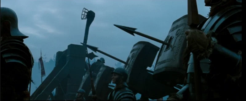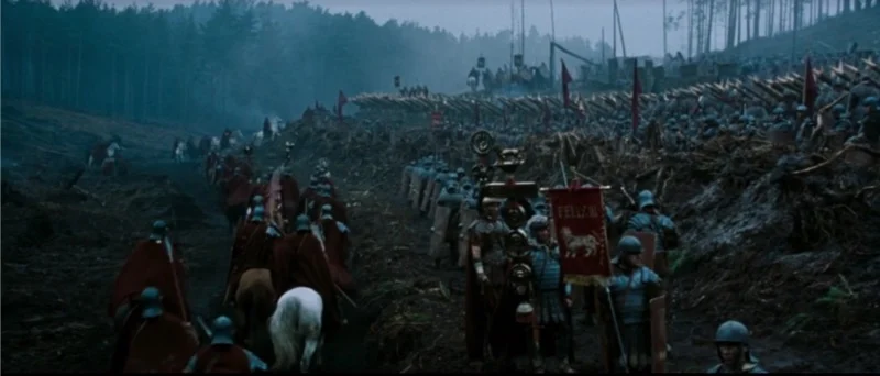 The first battle, set in the muddy forests of Germania against Germanic tribes, includes a funny mistake. If you look closely, you can briefly see a crew member in the background wearing modern clothes – blue jeans and a flannel shirt – standing near a horse. It’s a quick reminder that this is a movie set and not a real historical event, as everyone else is wearing costumes appropriate for the time period.