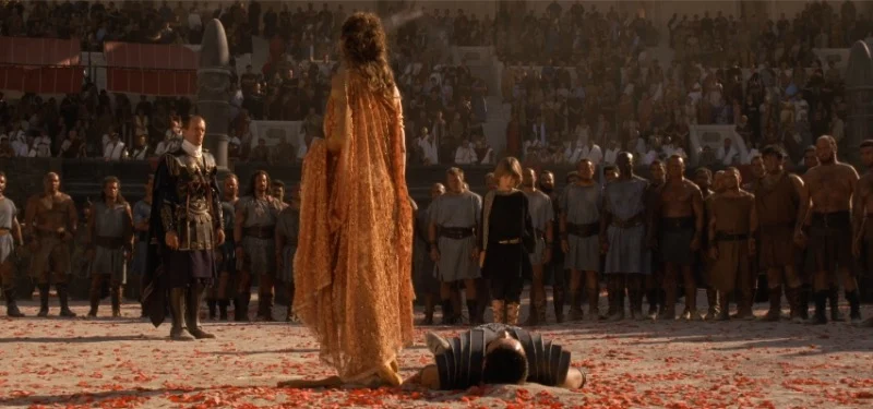During the arena scenes, there’s a noticeable error where the crowd’s cheering doesn’t quite match what you see on screen. An extra can be seen silently mouthing the line “Maximus the Merciful” a bit before the sound of the cheering starts. This makes it look like she somehow knows what’s going to happen in the script. These kinds of timing issues often happen when sound effects for large crowds are added during editing. Once you spot it, though, it’s actually a pretty amusing detail.