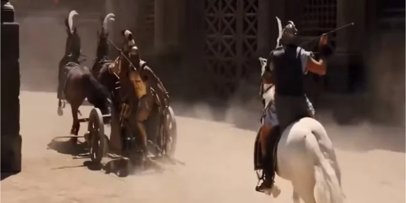 The movie shows actors riding with typical saddles and stirrups. However, Roman cavalry historically rode either bareback or with a different type of saddle and without stirrups. Director Ridley Scott chose to use modern equipment for safety reasons during the film’s challenging riding scenes, even though it wasn’t historically accurate. You can clearly see the saddles and stirrups during the battle scenes in the Germania forest. It was a practical decision to prioritize the safety of the actors and stunt team over complete historical detail.