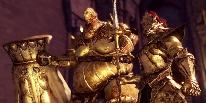 The entrance to this fight is set in Anor Londo’s grand cathedral, featuring echoing footsteps and a sweeping camera angle. Ornstein charges in quickly, while Smough arrives with powerful force, shaking the ground. The arena is designed with pillars that will become important during the battle. The music doesn’t start immediately; the choir pauses, allowing players to see the two bosses and understand their roles before the music swells.