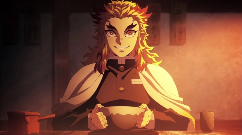 Before the adventure on the ‘Mugen Train’ begins, Kyojuro Rengoku shows his kind heart by buying several boxed lunches from a vendor. He politely thanks both the elderly woman selling them and her granddaughter. He continues to be friendly and considerate, greeting train staff and passengers and making sure everyone is doing well before departure. His repeated exclamation of “delicious” adds a cheerful touch as he finds his seat. This establishes him as a protector, looking out for everyone on board even before any threat arises.