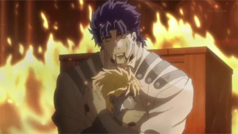 As the ship burns, Jonathan struggles to hold Dio captive, even as his own strength gives out. The anime shows him passing on the mask and entrusting a pregnant woman to Erina for safekeeping before the ship explodes. By doing so, he ensures his family line continues and stops Dio from harming anyone else at that time. This decision ultimately creates the foundation for future generations to battle Dio’s evil.