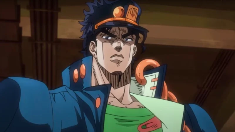 Jotaro’s unique school uniform—a modified gakuran with a long coat, heavy chain, and hat that flows into his hair—has become iconic to ‘JoJo’s Bizarre Adventure.’ The animators at David Production cleverly use the coat’s movement and the swinging chain to emphasize his attacks and stances. The consistent gold details and dark colors ensure he always stands out, no matter the scene’s color scheme.