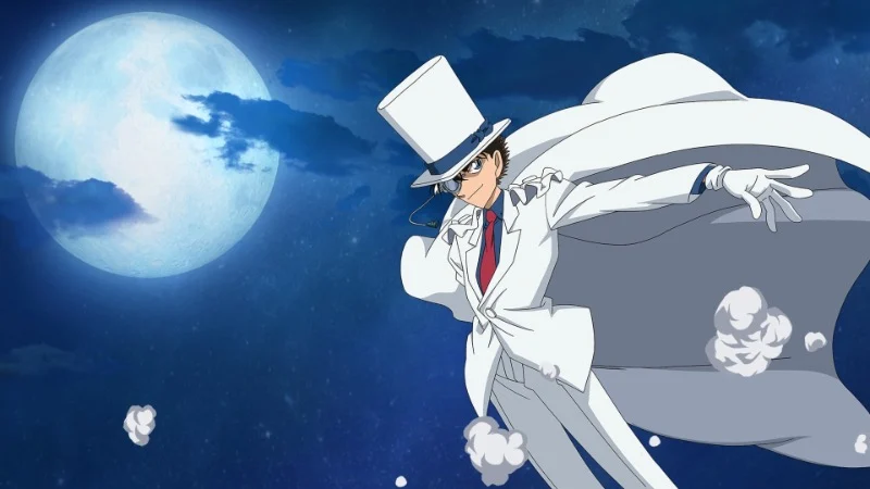 The character in number 11 demonstrates that a cape can be practical as well as stylish. His signature look – a white suit, monocle, and top hat – establishes him as a master thief in special episodes of both ‘Detective Conan’ and ‘Magic Kaito’. The animation studio, TMS Entertainment, carefully animates his cape, giving it flowing curves that highlight his silhouette without hiding his quick movements. The contrast between his white outfit and blue tie ensures he’s easily visible, whether he’s operating under the night sky or on a brightly lit stage.