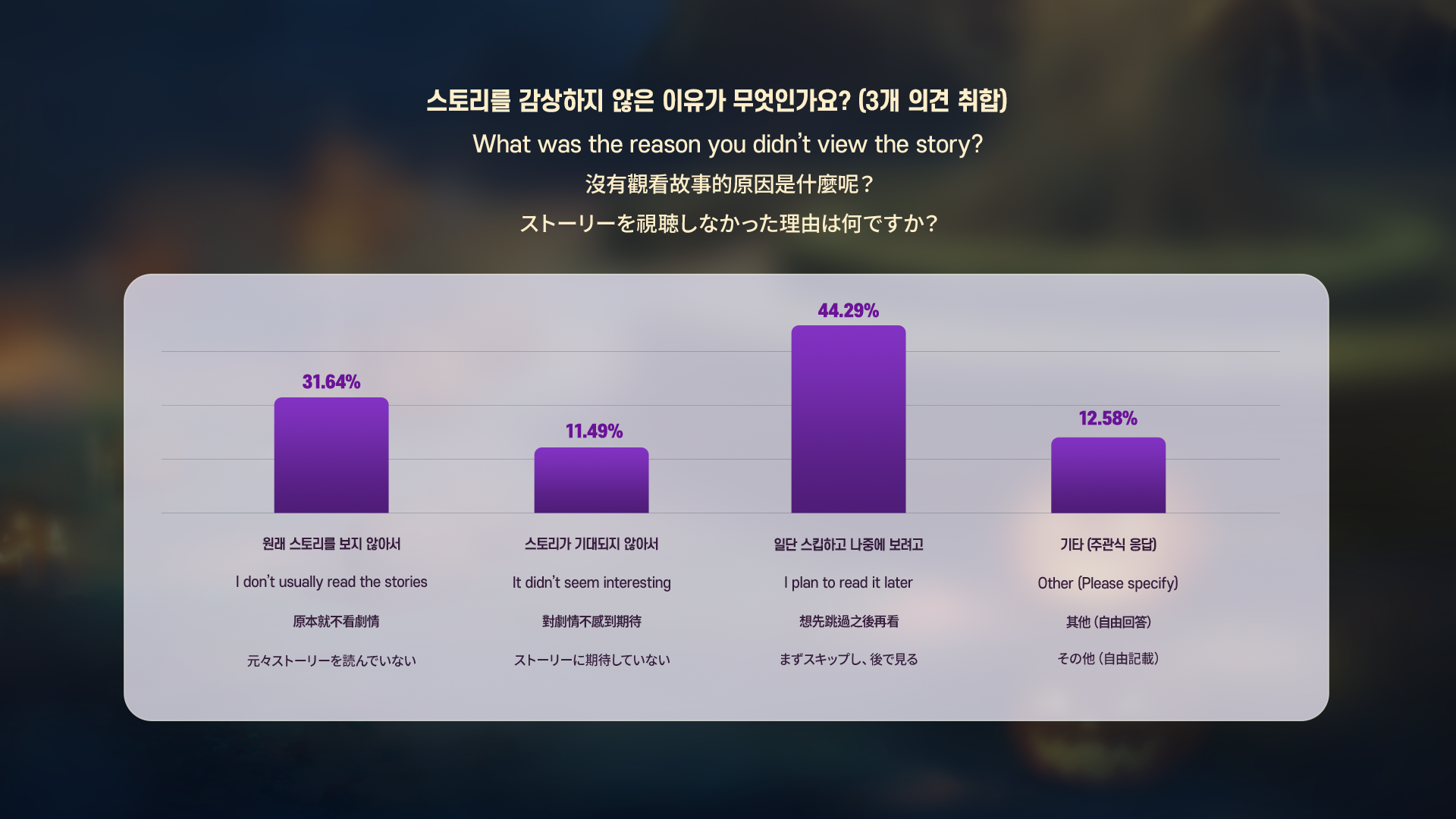 We also surveyed players who didn’t watch the story to understand why. The most common responses were that they intended to watch it later (44%) or that they generally skip stories (31%). Other reasons included a lack of interest in the story (12%) and various other factors (11%). These results were consistent across all three stories and are presented as combined data.