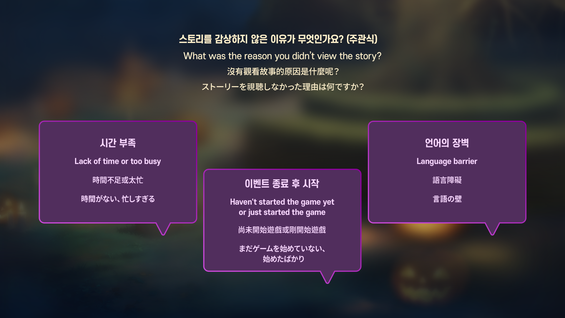 When asked why they didn’t respond further, many people mentioned being too busy, waiting until the event was over, or needing language translation. Some also explained they tend to focus only on the main storyline and prefer cutscenes over dialogue presented as still images.