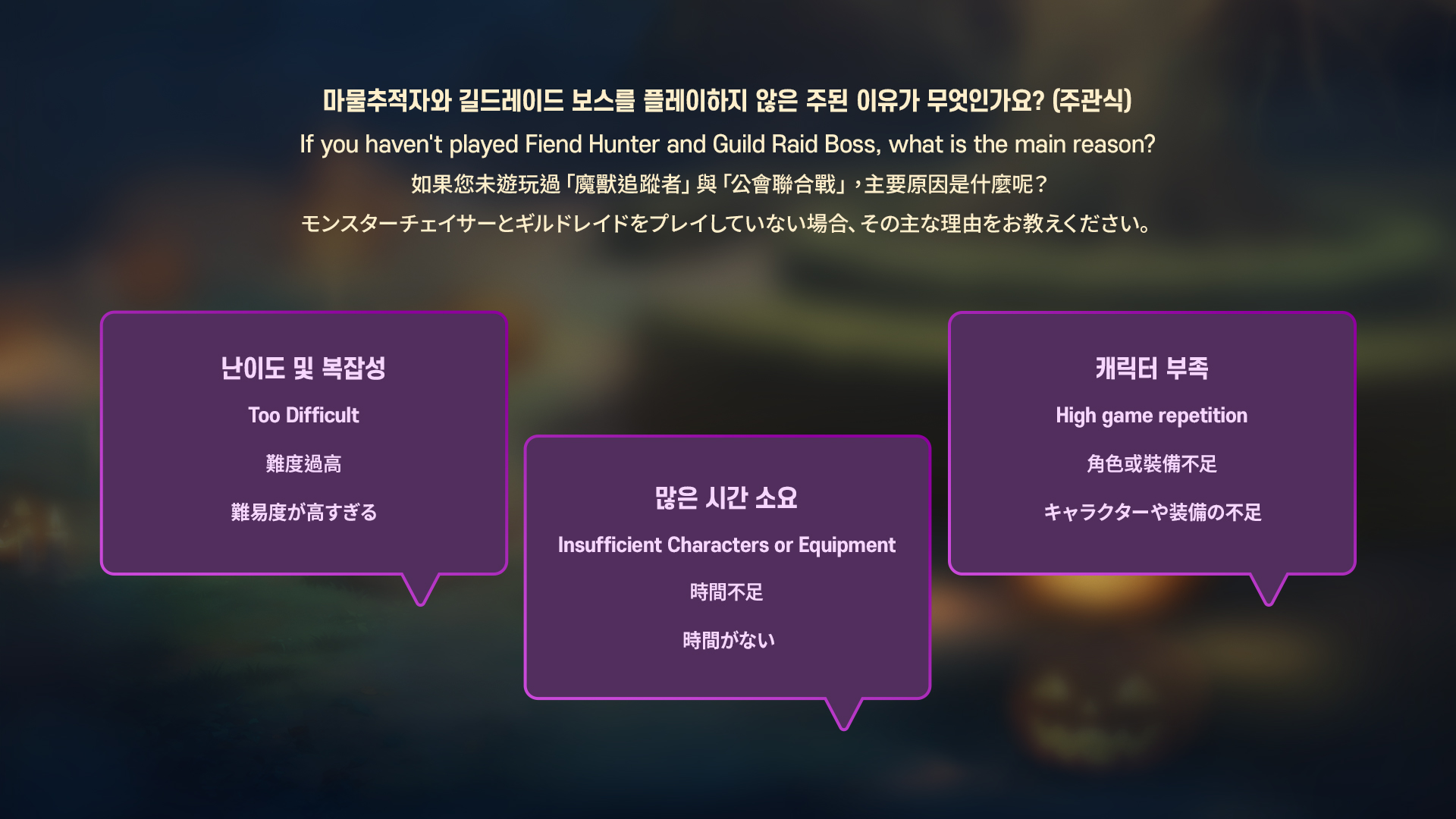 Next, we reviewed the open-ended responses on why players didn’t participate in Fiend Hunter or Guild Raid.
