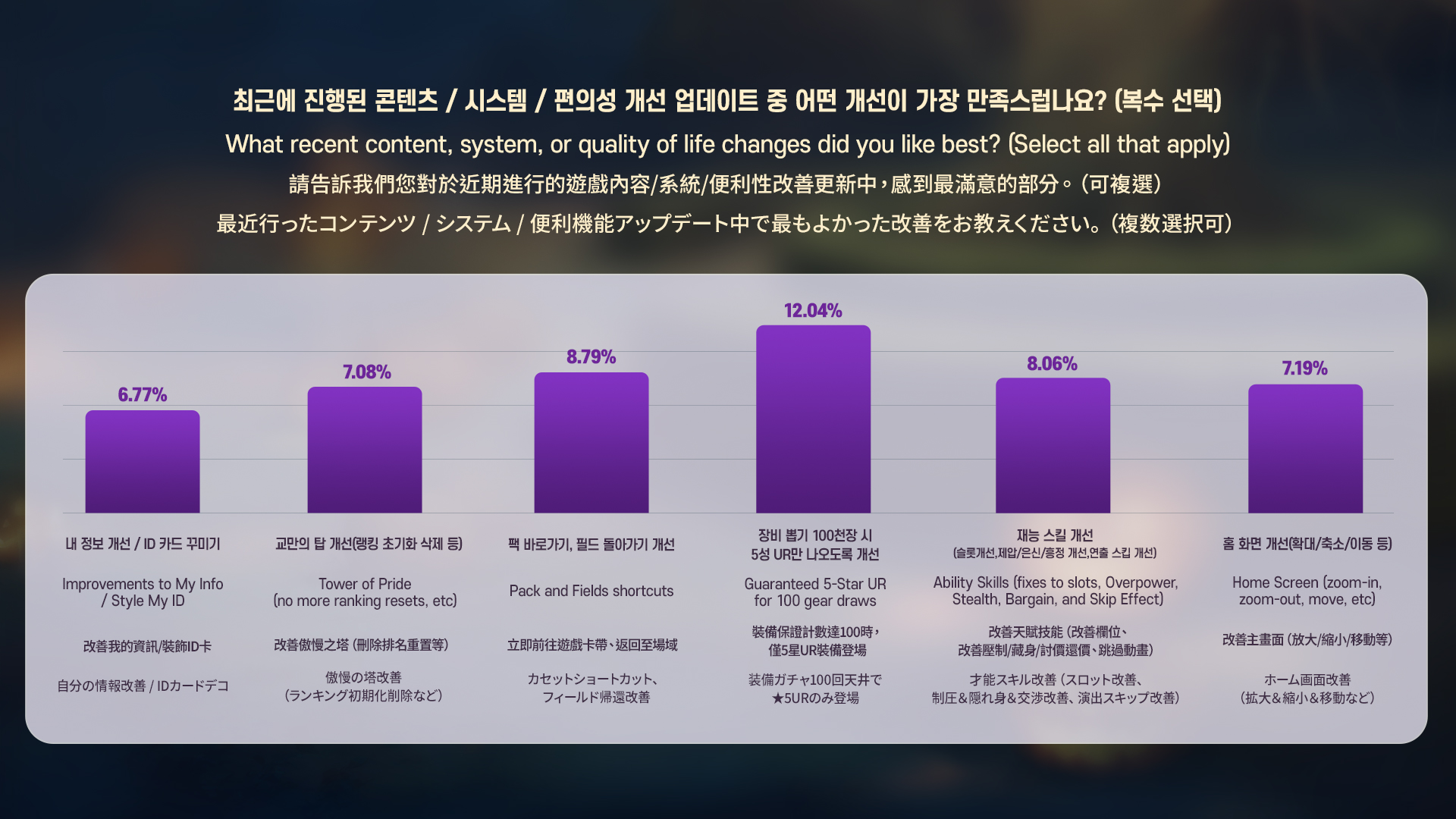 We recently surveyed players about which updates they liked the most. Here are the highlights: the biggest improvement, according to player feedback, was the guaranteed 100 pulls in Gear Draw. Players also really appreciated the Pack shortcut and the ability to skip animations for Ability Skills. Other popular updates included a clearer display of resources on the World Map Hunting Ground, improvements to the Tower of Pride, a refreshed Home screen, and a more organized Draw tab. While players appreciated the effort put into the ID Card customization feature, it didn’t receive quite as much positive feedback. We hope you enjoy these changes and continue to share your thoughts so we can make future updates even better!