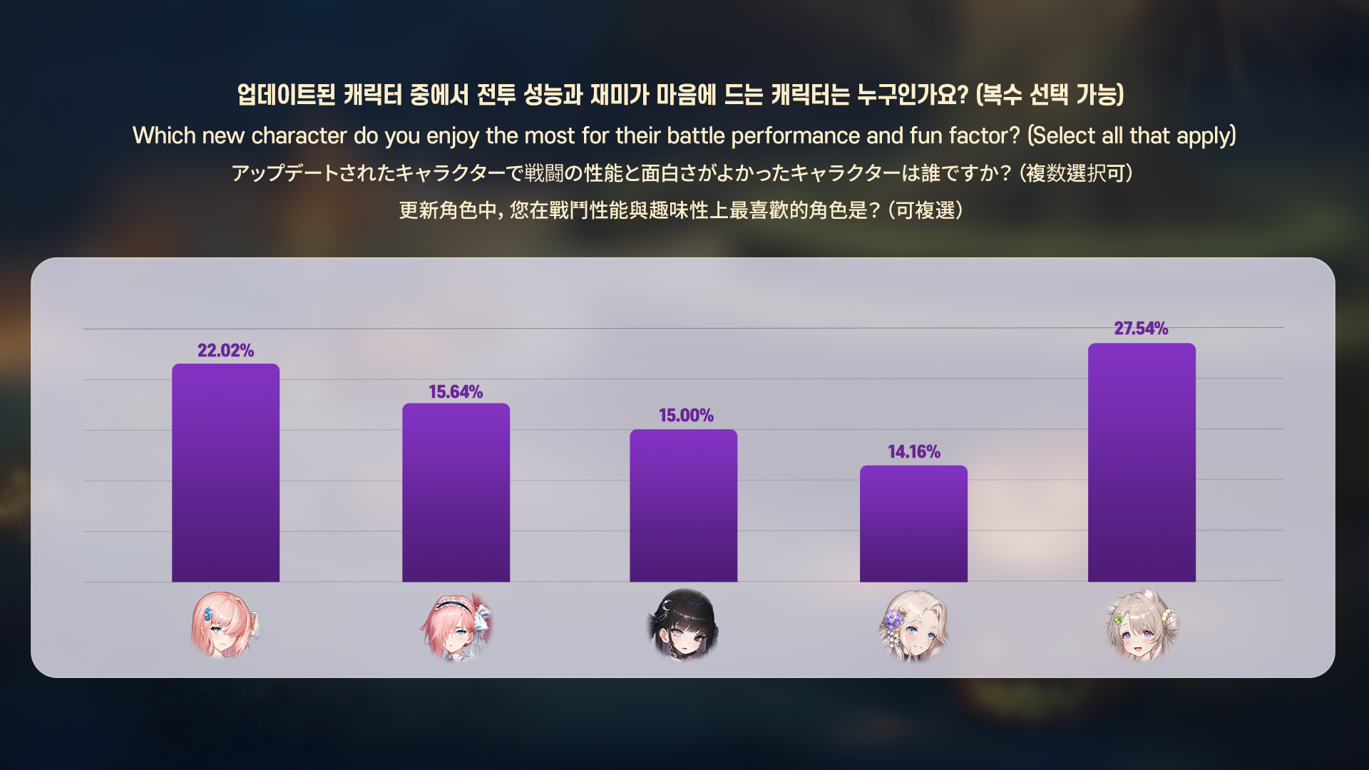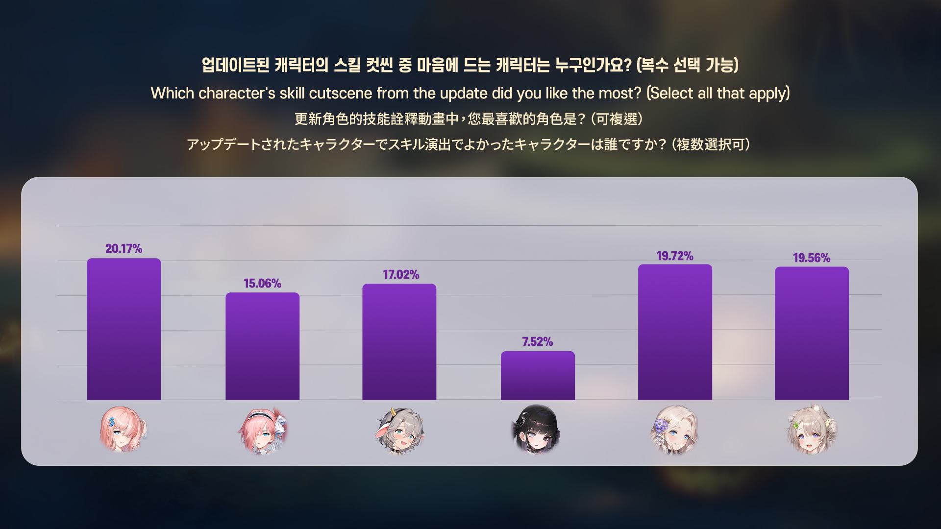 We surveyed players to find out which cutscenes for recently updated costumes they enjoyed the most. Darian and Tyr’s new cutscenes were the most popular, receiving 20% and 19% of the votes, respectively. Sylvia’s cutscene from the second summer update also scored highly with 20%. While Sonya’s cutscene was well-made and showed off her personality, it received fewer votes, likely because her younger appearance resulted in a less dramatic presentation. We recognize this difference in tone and are taking player feedback into consideration.