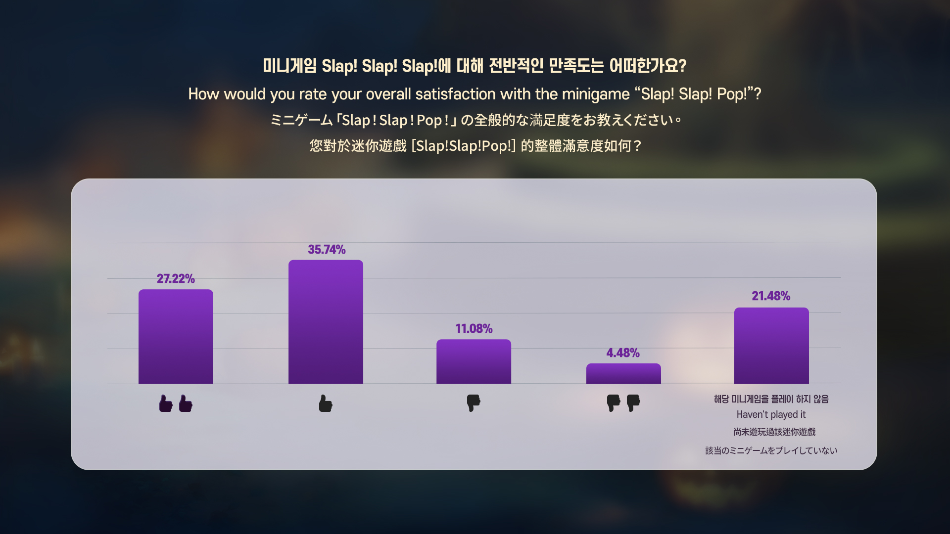 Here’s a summary of the Slap! Slap! Pop! minigame survey. The game initially generated a lot of excitement, with 62% of players reporting they were either ‘Very satisfied’ (26%) or ‘Mostly satisfied’ (36%). A total of 16% expressed negative feedback, and 20% hadn’t yet played the game. Players generally liked the core idea of the game, but many found it difficult and the controls a bit clunky, which likely impacted their overall enjoyment. We’re hoping recent improvements will make the game even better!