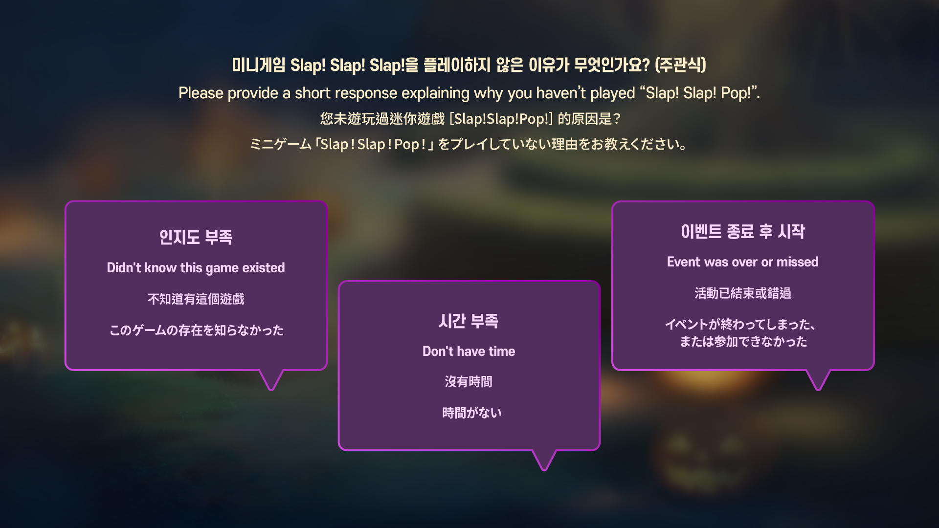 We looked at the feedback from players who didn’t participate in Slap! Slap! Pop!. The most common reasons were that they simply didn’t know about the mini-game, didn’t have enough time to play, or tried to join after the event was over. Some players also said they weren’t interested in rhythm games, had trouble playing on their computers, or found the game too difficult.