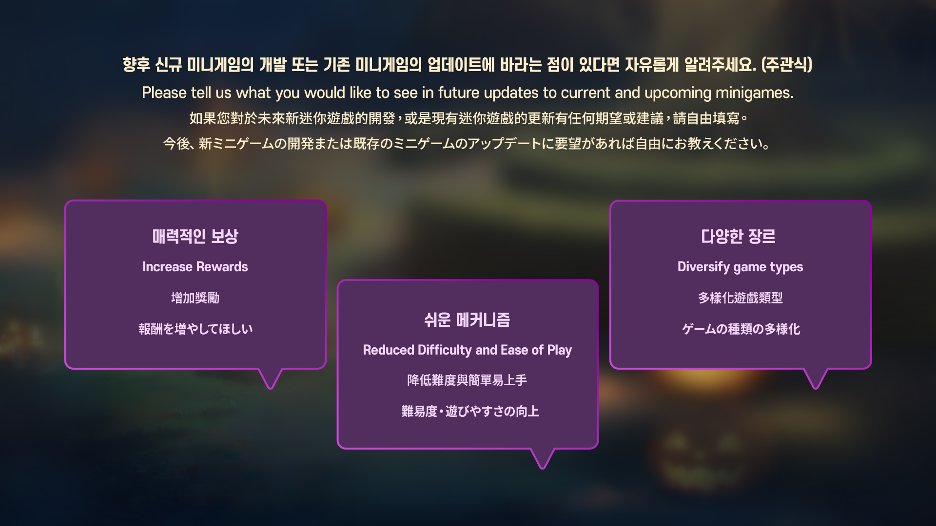We recently surveyed players about future minigames and updates, and here are the key takeaways. Players want better rewards to encourage participation, and they prefer minigames that are easy to learn and play. A wider range of minigame types would also help keep things interesting. Finally, players asked for improvements to the PC version and requested that minigames be available all the time, not just during special events.