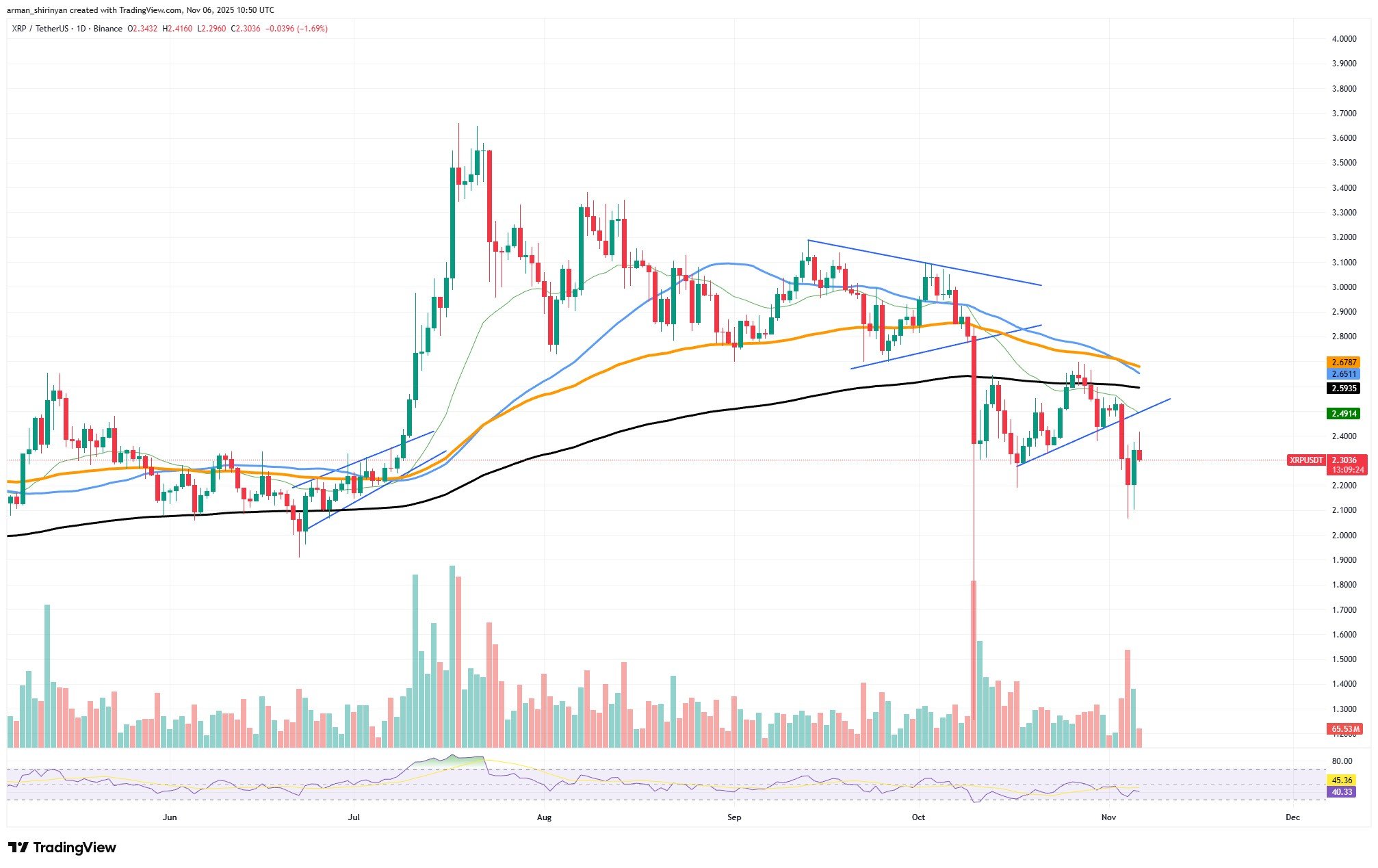 As the clock ticks, XRP lingers at a meager $2.30, its price sagging like a deflated balloon, down 1.5% on the day. The once-proud token, which strutted near $3.50 earlier this year, now shuffles in the dust, its downward spiral a grim testament to the merciless nature of the markets. The charts, those cold and unforgiving scribes of fate, paint a picture darker than a Siberian winter. Rejected at the $2.60-$2.70 zone, XRP failed to breach the iron curtain of the 50-day EMA (blue) and the 200-day EMA (black), its dreams of ascent crushed under the boot of descending resistance. 📉❄️