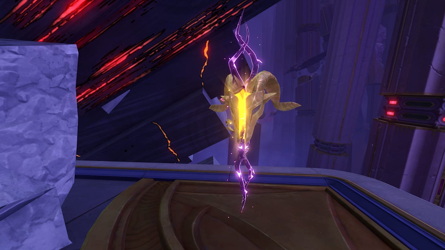 Turn left and go around to the orange button to restart the portal. Once it’s active, quickly jump into the teleporter. This will swap your location with your shadow. Then, activate the blue button to send your shadow down to the lower level, and finally, make your way to the pyre.