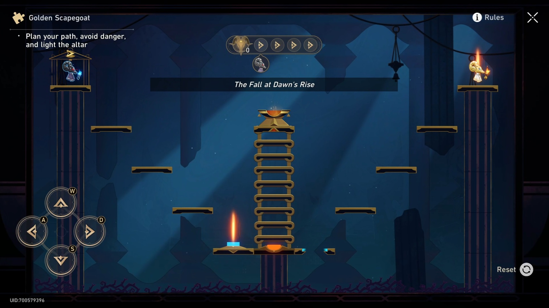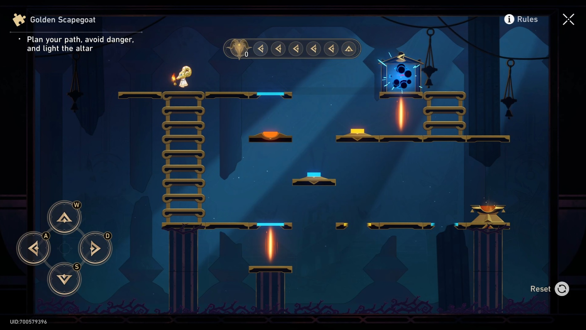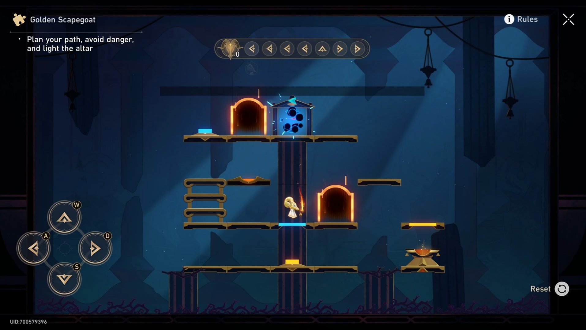 This part can be a little challenging. Carefully enter the portal. Once you’re through, jump down to the yellow button, then to the rightmost blue button, back to the yellow one, and again to the blue button on the right. After that, climb the ladder and jump back onto the yellow button. Repeat this – climb the ladder, jump to the yellow button, and move to the right blue button – one last time. This will reactivate the portal with your shadow, letting you reach the pyre.