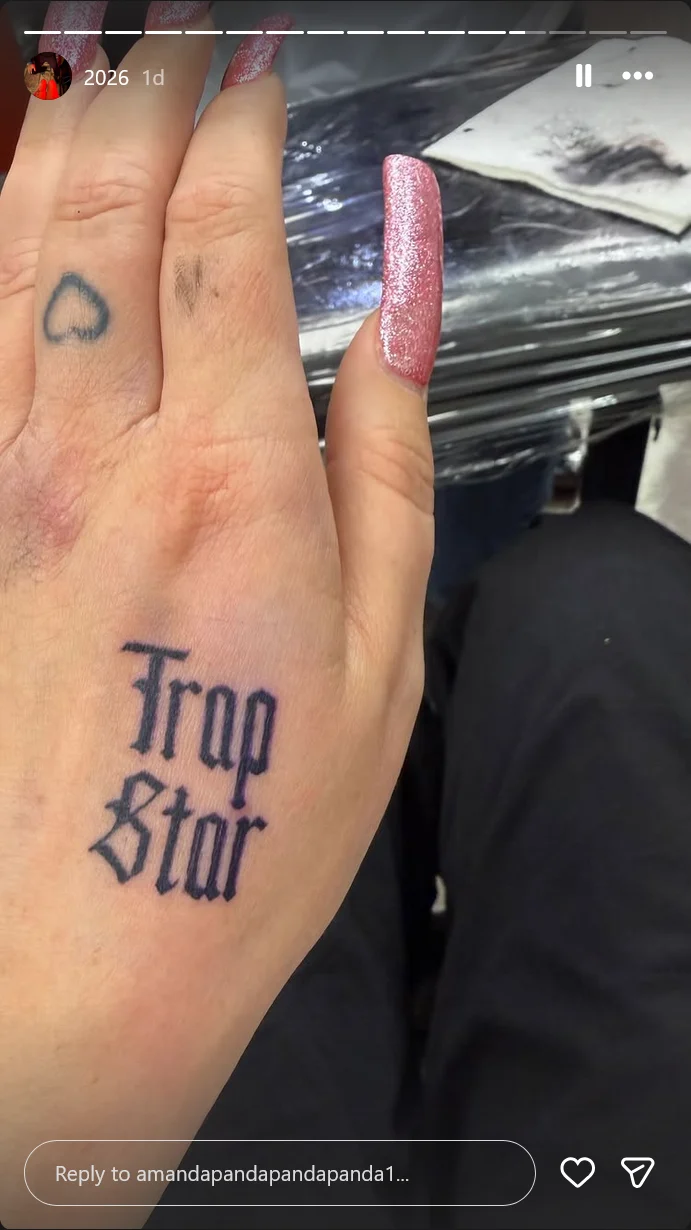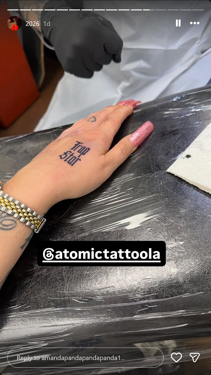 The actress, known for her work on Nickelodeon, showed off her newest tattoo on Instagram Wednesday. It says “Trap Star” in big letters on her left hand. She got the tattoo at Atomic Tattoo & Body Piercing in Los Angeles, and it’s the latest addition to her growing collection, which already includes tattoos of a snake, a rose, a heart, and the number 10 in Roman numerals.