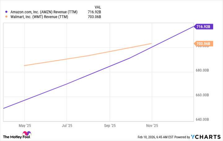 Walmart will report its 2026 fiscal fourth-quarter results (ended January 31st) next week. To match Amazon’s revenue, it would require an additional $14 billion, or a 7.7% increase. To overtake it? A considerably larger leap. One imagines the board meetings are… animated.