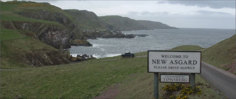 As the story moves to New Asgard, a sign appears by the side of the road. Initially, the sign looks worn and faded, with rough lettering. However, in subsequent scenes, the sign appears cleaner and the letters seem slightly more spaced out, particularly between the words on the second line.