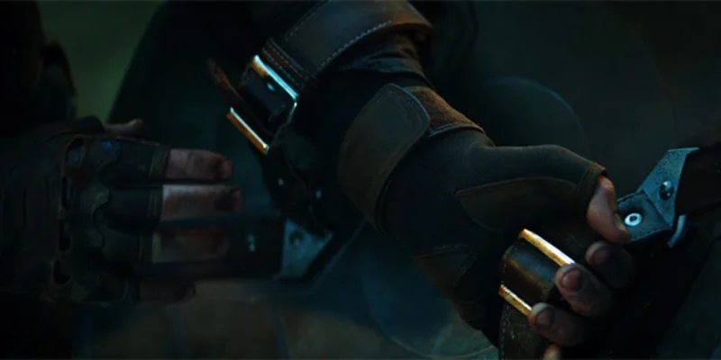 As the camera pulls back to show more of the scene, the gauntlet appears to be set up for a right-handed user again. The way the fingers and thumb are positioned clearly shows it doesn’t quite fit with the rest of the gauntlet’s consistent design, suggesting a problem with how it was quickly put on.
