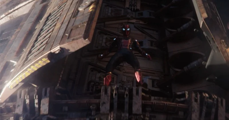 After the chase in the park, Peter is pulled upwards towards the Q ship. He passes out while climbing, but the Iron Spider suit quickly activates, surrounding and containing him. A brief moment shows him breathing on his own for slightly longer than previously seen.