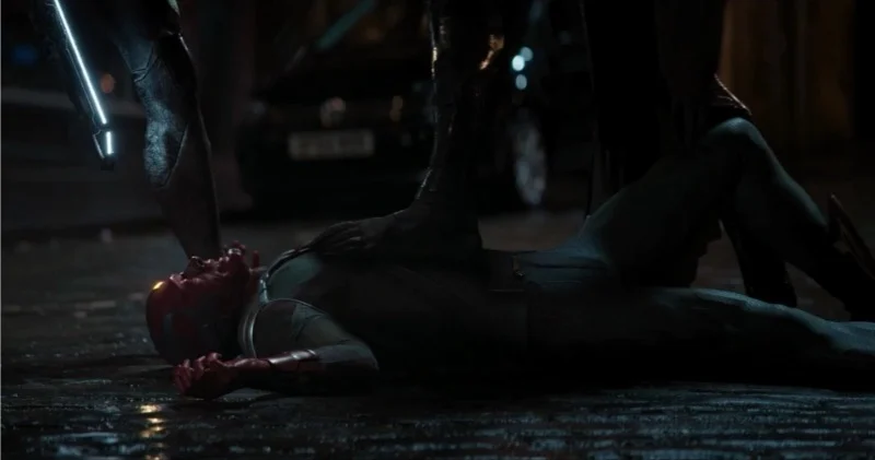 During the surprise attack, Corvus Glaive stabs Vision. As the battle moves from the streets to the train platform, the wound on Vision’s body seems to change position in a few shots, appearing in different places.