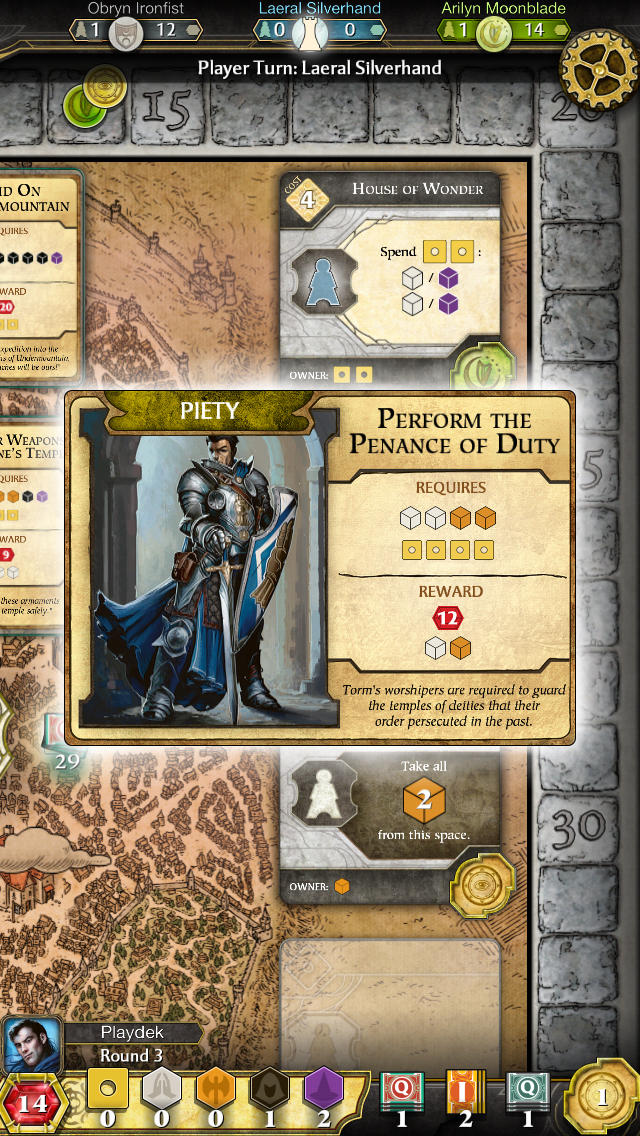 The Scoundrels of Skullport expansion introduces elements of corruption and new buildings. The game keeps track of these with tokens and helpful tooltips. It also features pass-and-play timers, an undo function for valid moves, and a detailed record of every placement and completed quest. New players can benefit from tutorial prompts and easy access to the game’s rules and scoring information.