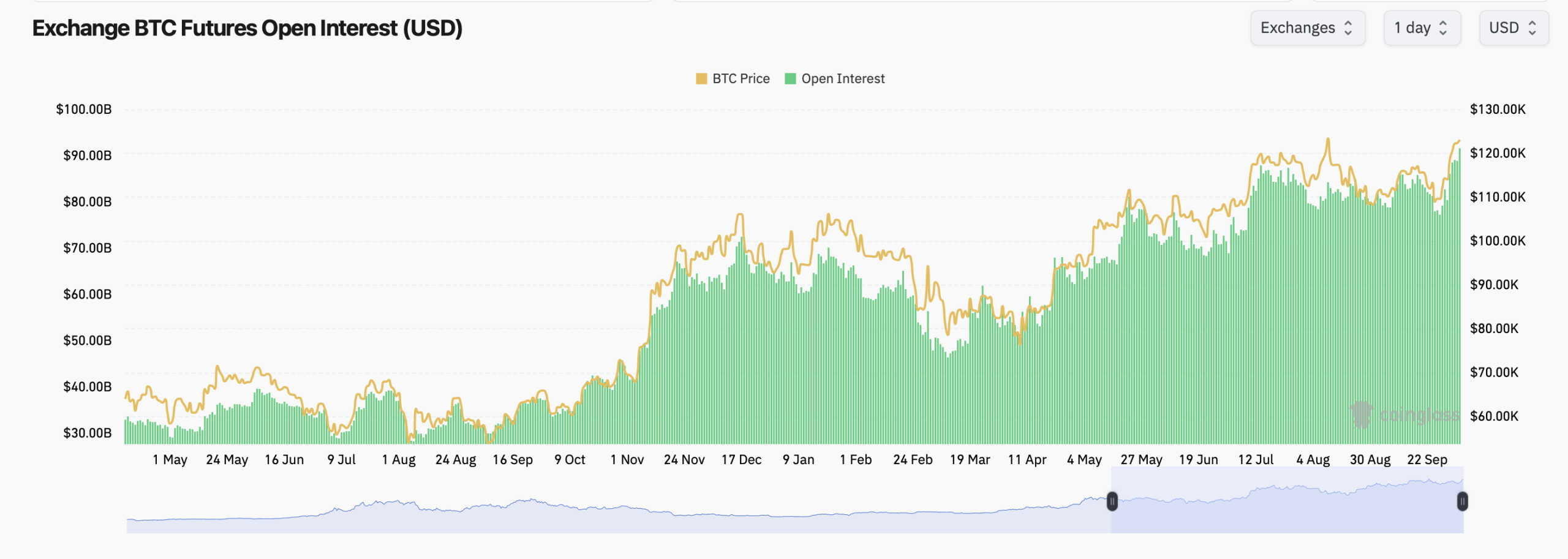 At the index level, Bitcoin flirted with $125,725 this week before settling at $123,142, and the derivatives crowd was like, “Hold my latte.” Aggregate futures open interest (OI) figures from coinglass.com hit an all-time high near $91.59 billion, up 2.04% on the day. Translation: traders are throwing caution to the wind and doubling down on their bets. The casino is open 24/7, and the chips are stacked higher than a Jenga tower after three mimosas 🍾.