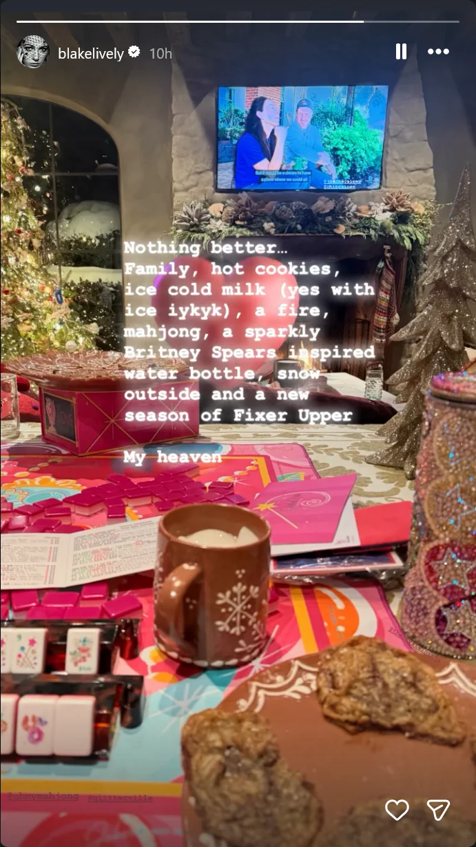 The post showed a warm and cheerful family day. Lively, 38, shared photos of herself enjoying treats like hot cookies and ice-cold milk, playing Mahjong, and watching the latest season of Fixer Upper with Chip and Joanna Gaines. She captioned it, “Nothing better…family, hot cookies, iced cold milk (yes, with ice, if you know, you know)!”