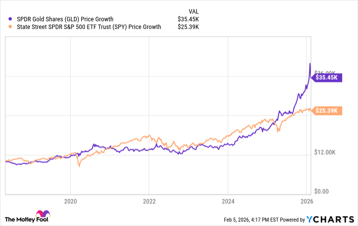Recently, I revisited these arguments, prompted by the renewed interest in gold. The price has risen, fueled by anxieties about inflation and geopolitical instability. I examined the performance of gold, specifically through the SPDR Gold Shares ETF (NYSEMKT: GLD), against the SPDR S&P 500 ETF Trust (SPY) since that 2018 Berkshire Hathaway meeting.