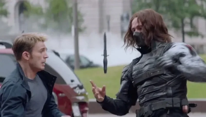 During the street fight following the chase, the Winter Soldier’s smeared eye black and dirt convincingly show how intense the battle is. The way the camera moves – quickly switching between close-ups and side views – emphasizes the changing darkness under his eye and the shifting dirt streak on his cheek, adding to the realism.