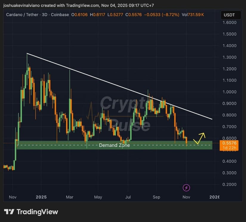 CryptoPulse insists ADA’s hit a “critical demand zone” between $0.50 and $0.55 – which, in layman’s terms, means people might start buying again because, well, it’s cheap. The descending trendline keeps slapping ADA down like an overzealous bouncer, but somehow, the price keeps bouncing back within this so-called “green support block.” (Honestly, who comes up with these names?)