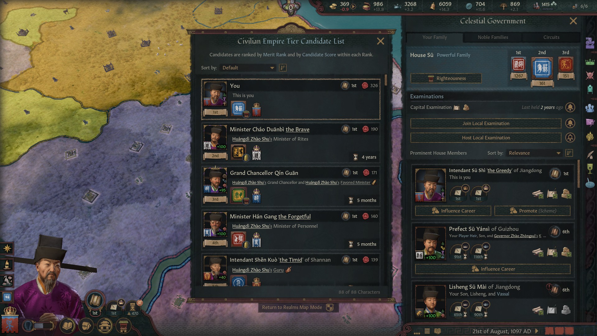 Building up your Merit is incredibly important. It raises your rank from 9th place to 1st (or 5th place outside of China), and this rank is the biggest thing the Emperor looks at when choosing governors and ministers – even more important than your initial potential. If you want a powerful position like governing a large region (similar to ruling a kingdom outside of China) or a role at the imperial court, you absolutely need a high Merit Rank.