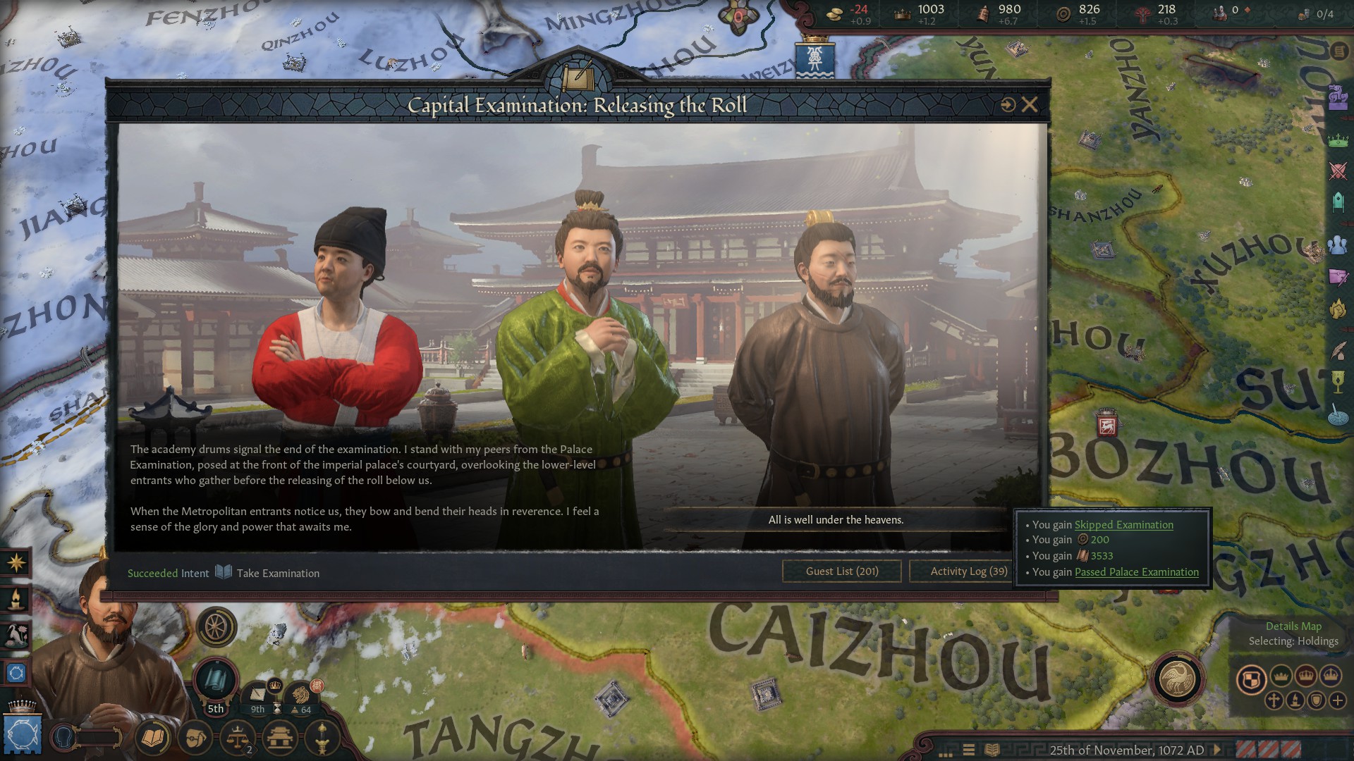 You face a choice: you can help with exams to gain Merit at any time, but if you want to take the exam yourself, you’ll have to resign from your current position. If you’re not confident you’ll pass the difficult Palace Examination, it’s smart to wait for the next one (they happen often) and keep governing your province – that way you can continue earning Merit and improving your skills to better your chances.