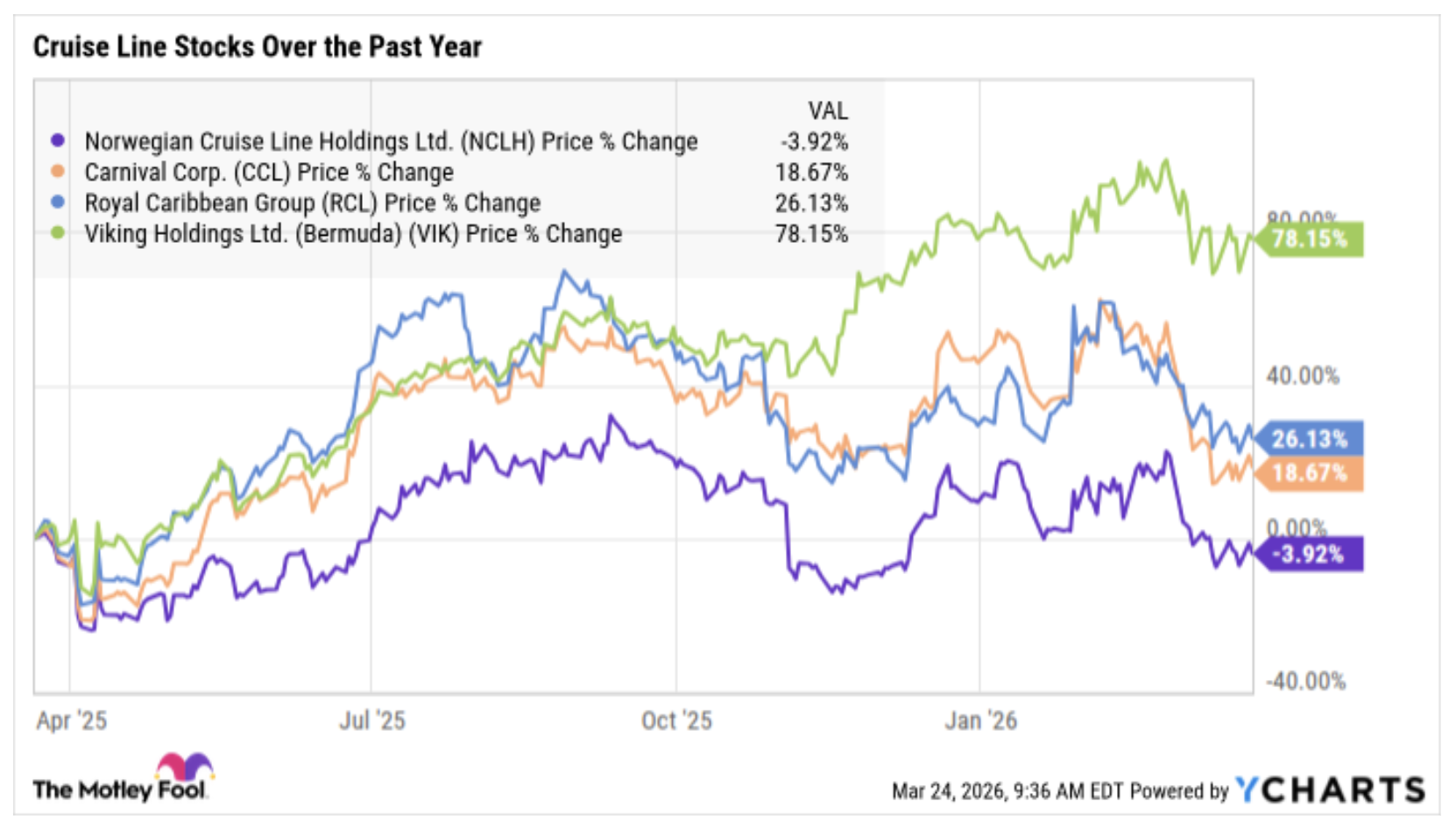 Viking is the outlier, trading at a premium. And it’s actually beating the market. Which makes sense. It’s a niche player, targeting a wealthier clientele. It’s like comparing a budget airline to a private jet. Different markets, different expectations.