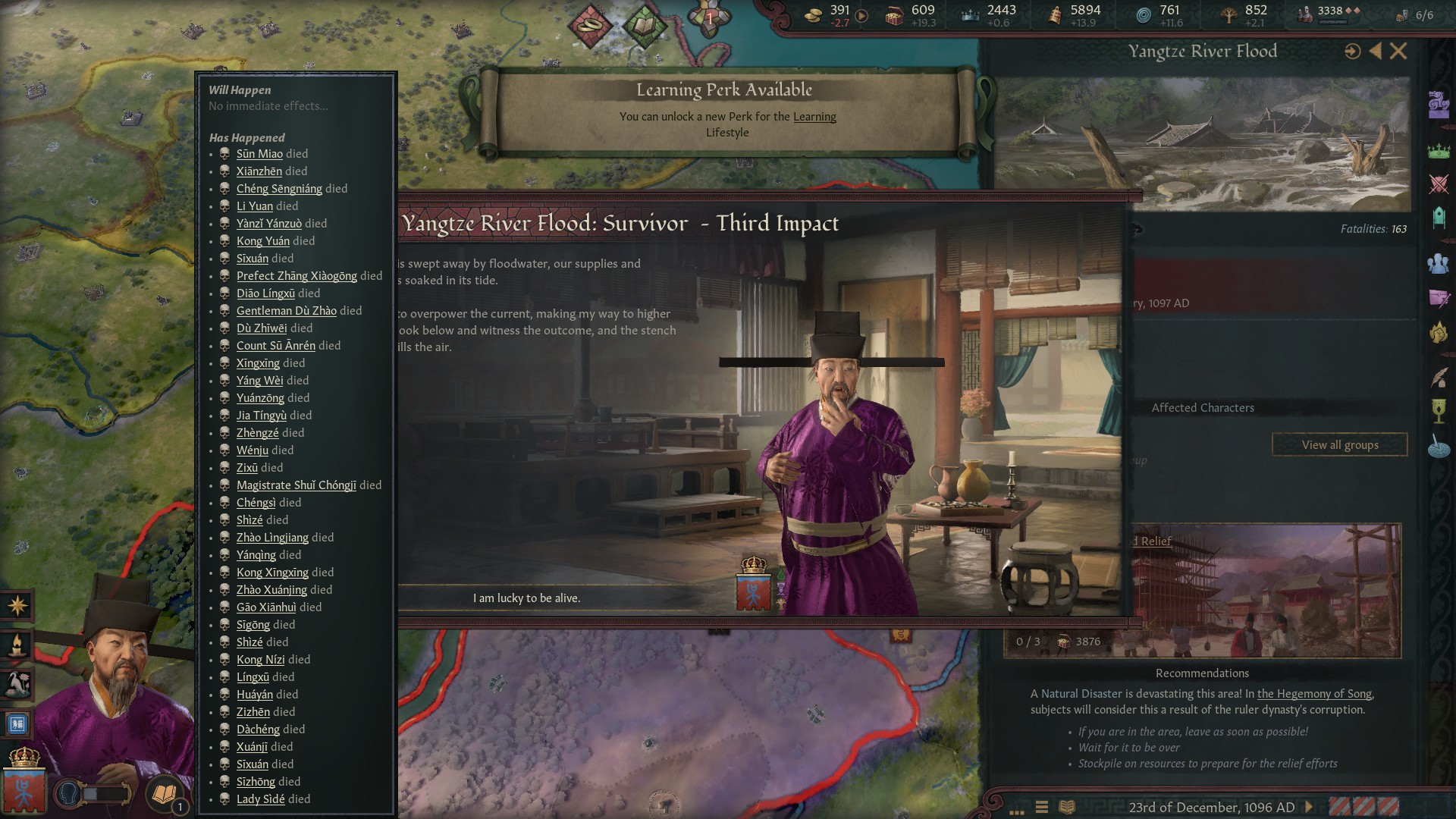 It’s incredibly refreshing to play something different. In Europe, my games always seem to turn into attempts to rebuild the Roman Empire, meaning lots of warfare. But climbing the ranks in China’s government has been surprisingly peaceful – I’ve spent hours focusing on scholarly discussions, witty debates, and the occasional bit of scheming. The most powerful figure in China turned out to be an elderly, unassuming scholar who truly lived by Confucian ideals… and was secretly plotting to overthrow the emperor, which is a classic storyline for a reason. He even appointed me as his most trusted advisor, giving me extra funds, and became one of my students!