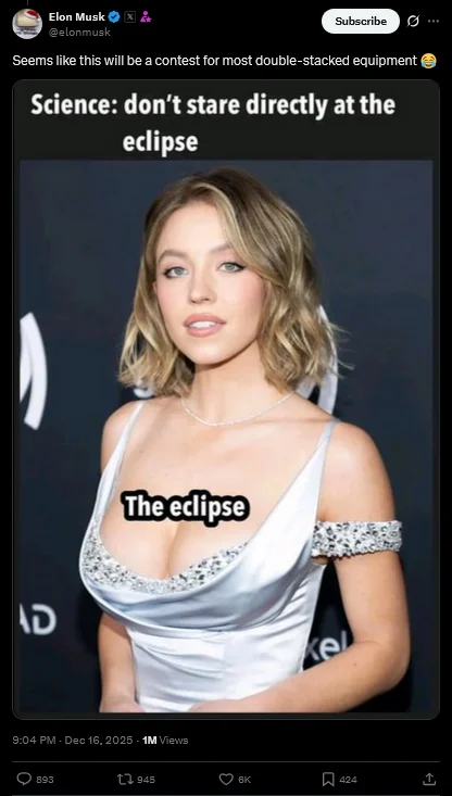 Even after the criticism started rolling in, Musk just kept going. About an hour later, he posted another meme, this time referencing the game Diablo. It was a doctored photo of Sweeney, with the words “the eclipse” emblazoned across her chest. And the caption? He wrote, “Seems like this will be a contest for most double-stacked equipment.” Honestly, it felt like he was doubling down, and it wasn’t a good look.