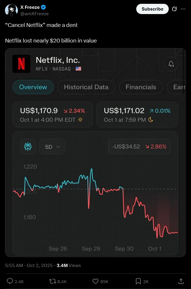 Netflix’s value has reportedly dropped around $20 billion as many users have started canceling their subscriptions. This negative reaction is said to have begun after Elon Musk encouraged people to boycott the streaming platform.