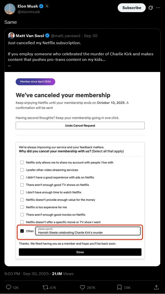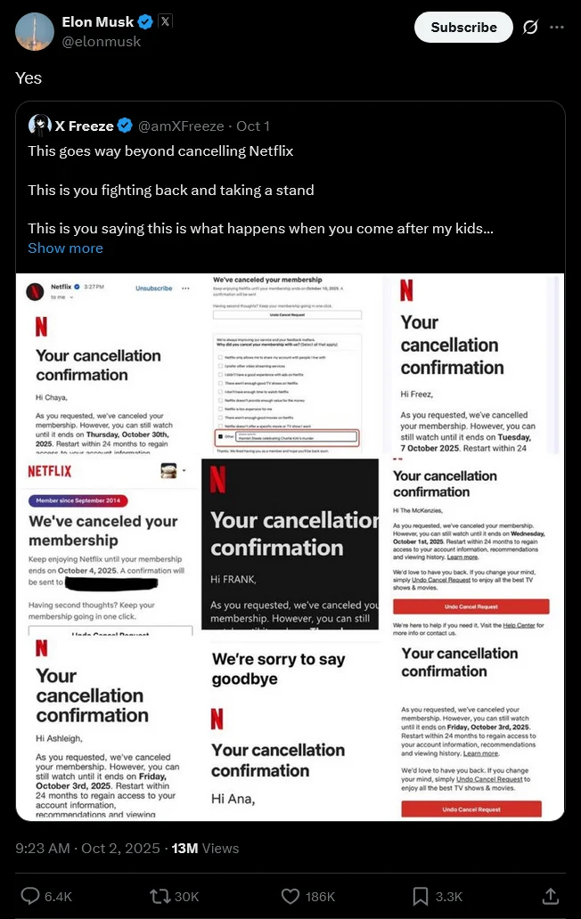 As a critic, I’ve been watching the fallout from Elon Musk’s comments, and it’s fascinating. Political commentator Gunther Eagleman quickly jumped on board, essentially telling his followers on X to “Cancel Netflix,” – a message that Musk himself then amplified by sharing it. It’s a clear show of support, and a pretty direct call to action, if you ask me.