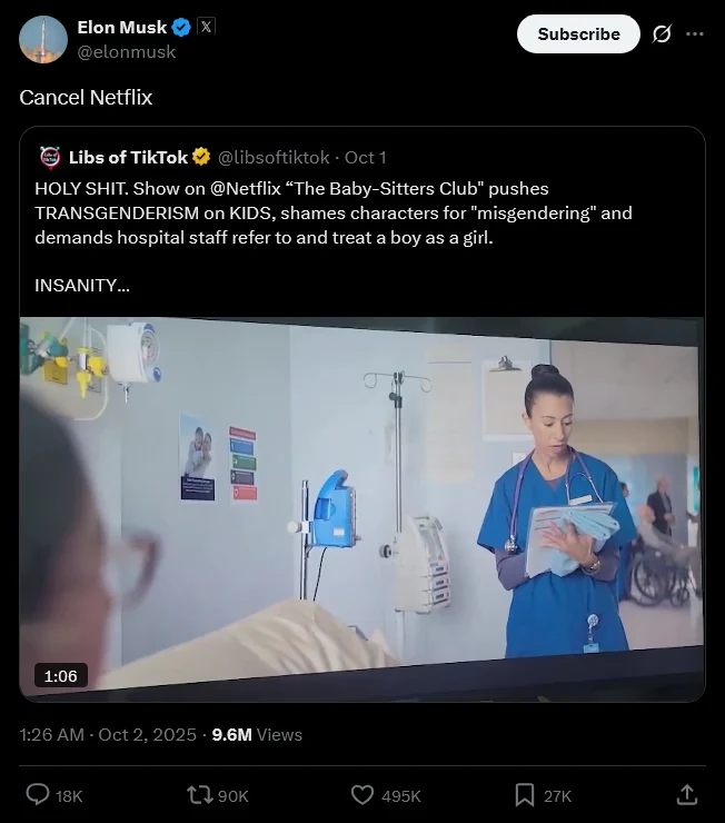 Other programs, like The Baby-Sitters Club, have faced similar backlash. For example, one moment showed a character correcting a nurse for using the wrong pronouns for a child, and some people on the right, including Elon Musk, felt this wasn’t suitable content for children.