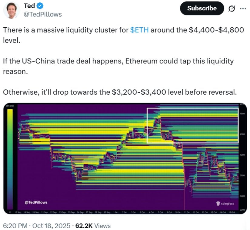 Ah yes, liquidity clusters-those magical places where prices just… seem to gravitate. There’s one between $4,400 and $4,800, which, according to investor Ted (@TedPillows), could lure Ethereum’s price like a moth to a flame. Ted explains, “If the US-China trade deal happens, Ethereum could tap this liquidity. If not, we might be looking at a drop to $3,200-$3,400 before the inevitable reversal.” Ah, the sweet uncertainty of geopolitics. 🌍