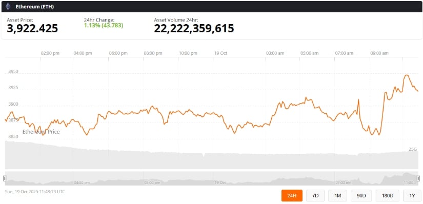 As of October 19, 2025, Ethereum is trading around $3,900, with a staggering 24-hour trading volume of over $22 billion. After its little dip to the $3,800 range, some analysts think this level is the foundation for the next moonshot. But hey, what do they know? 🤡