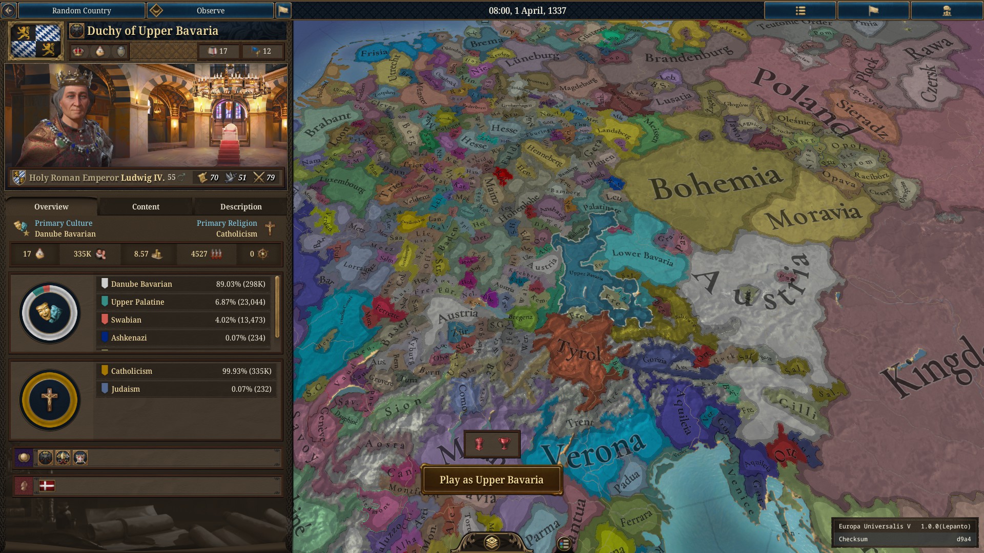 Unlike typical countries in Europa Universalis IV, the Holy Roman Empire is an organization. To begin a game as the Holy Roman Emperor in 1337, you don’t select Austria – you need to choose the member state currently ruled by the Emperor, which is actually Upper Bavaria.