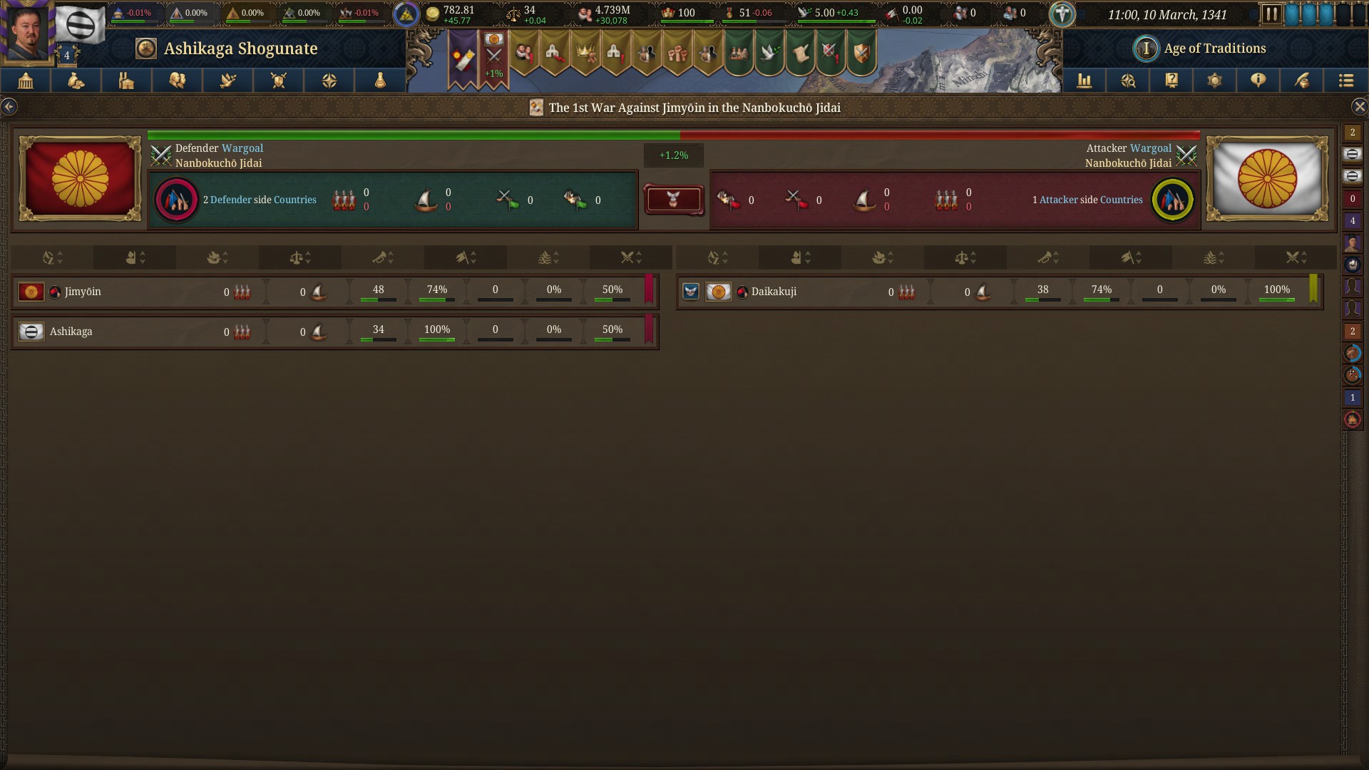 I’m torn about how Crusader Kings III handles missions now that they’ve replaced the old ‘Tinto’ system. While these new political situations and interactions with international organizations do offer some guidance – for instance, Japan’s dual imperial courts create unique religious dynamics – the game fails to clearly explain how to resolve them. As the shogun, I’m blocked from taking necessary actions, and there’s no way to change my role or eliminate the rival claimants. Declaring war on them is possible, but pointless, as they lack armies or land, leading to automatic peace treaties. To make matters worse, a major civil war (the Sengoku Jidai) inevitably erupts after a century, regardless of how well you govern, and you’ll likely lose a significant portion of your territory to smaller factions that you then have to reconquer. It feels like a goal to work towards, but it’s frustrating to have so much progress undone without any real agency or control.